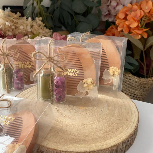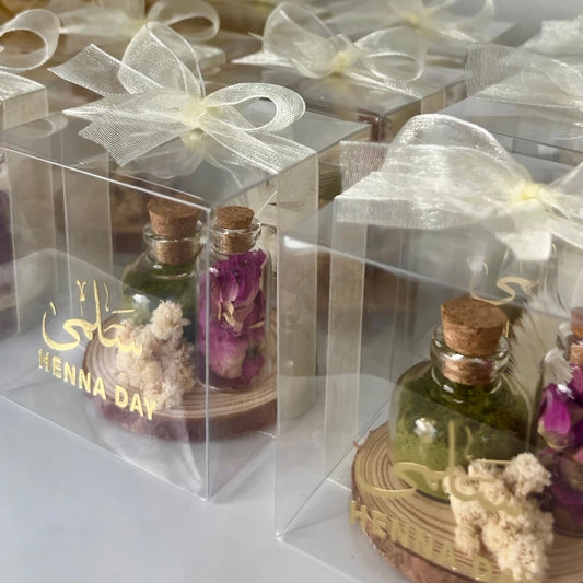 Coffret Cadeau pour Soirée Henné – Flacons en Verre avec Poudre de Henné & Fleurs Séchées