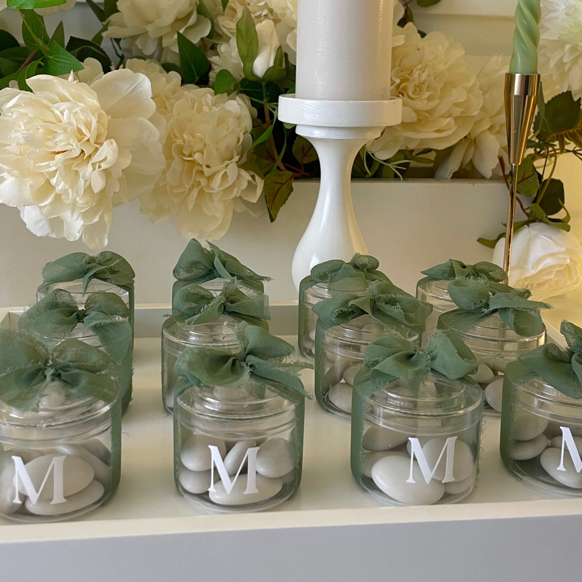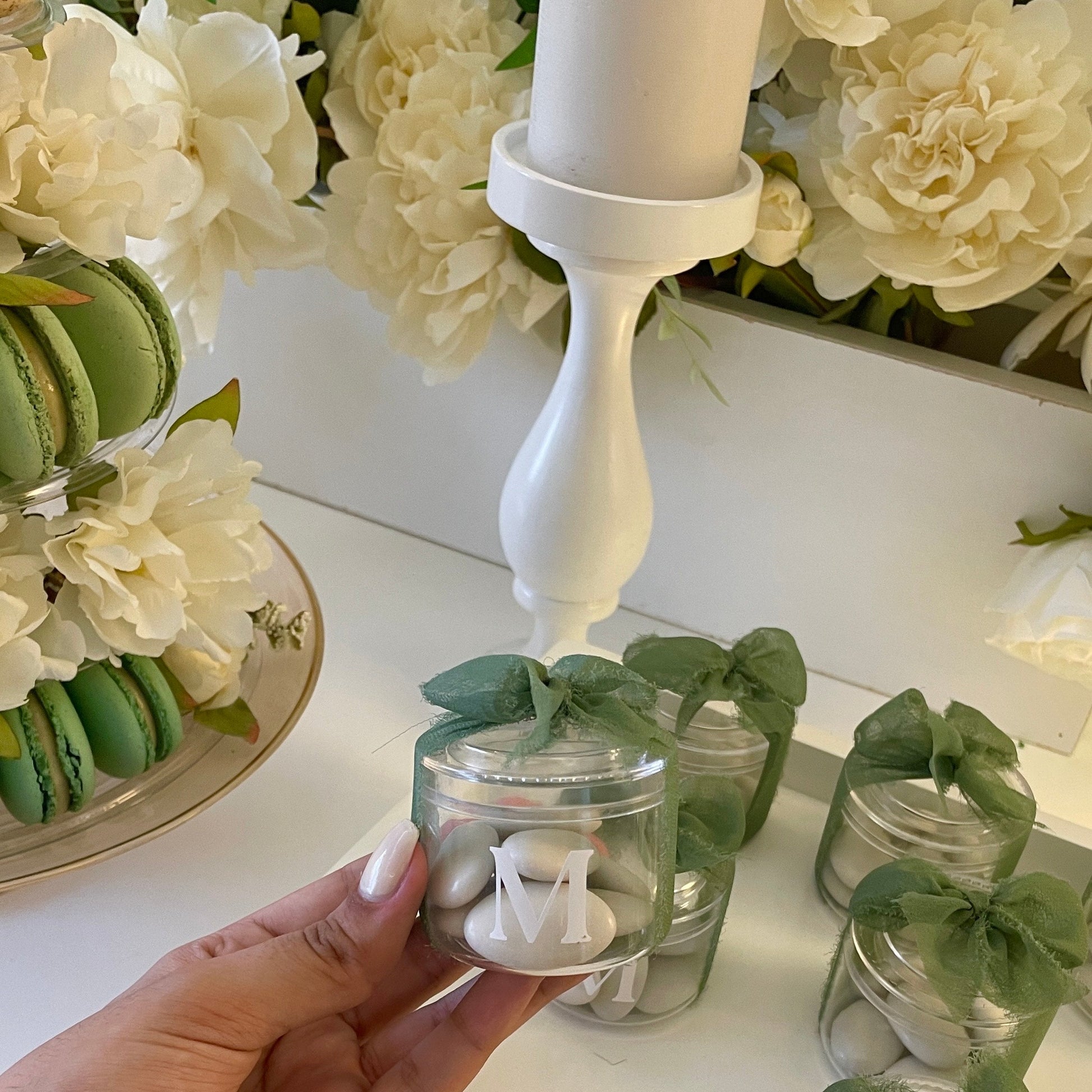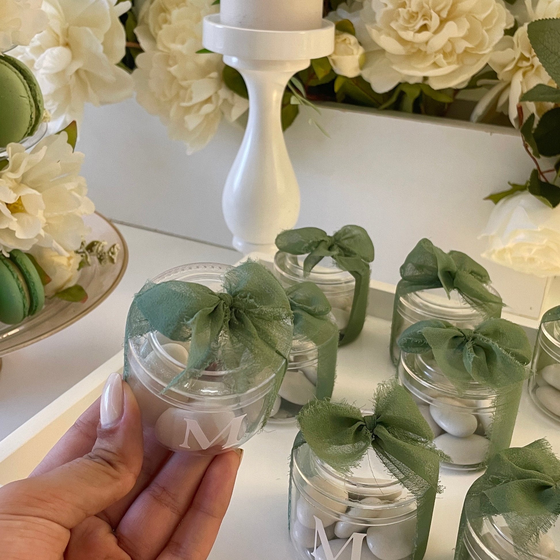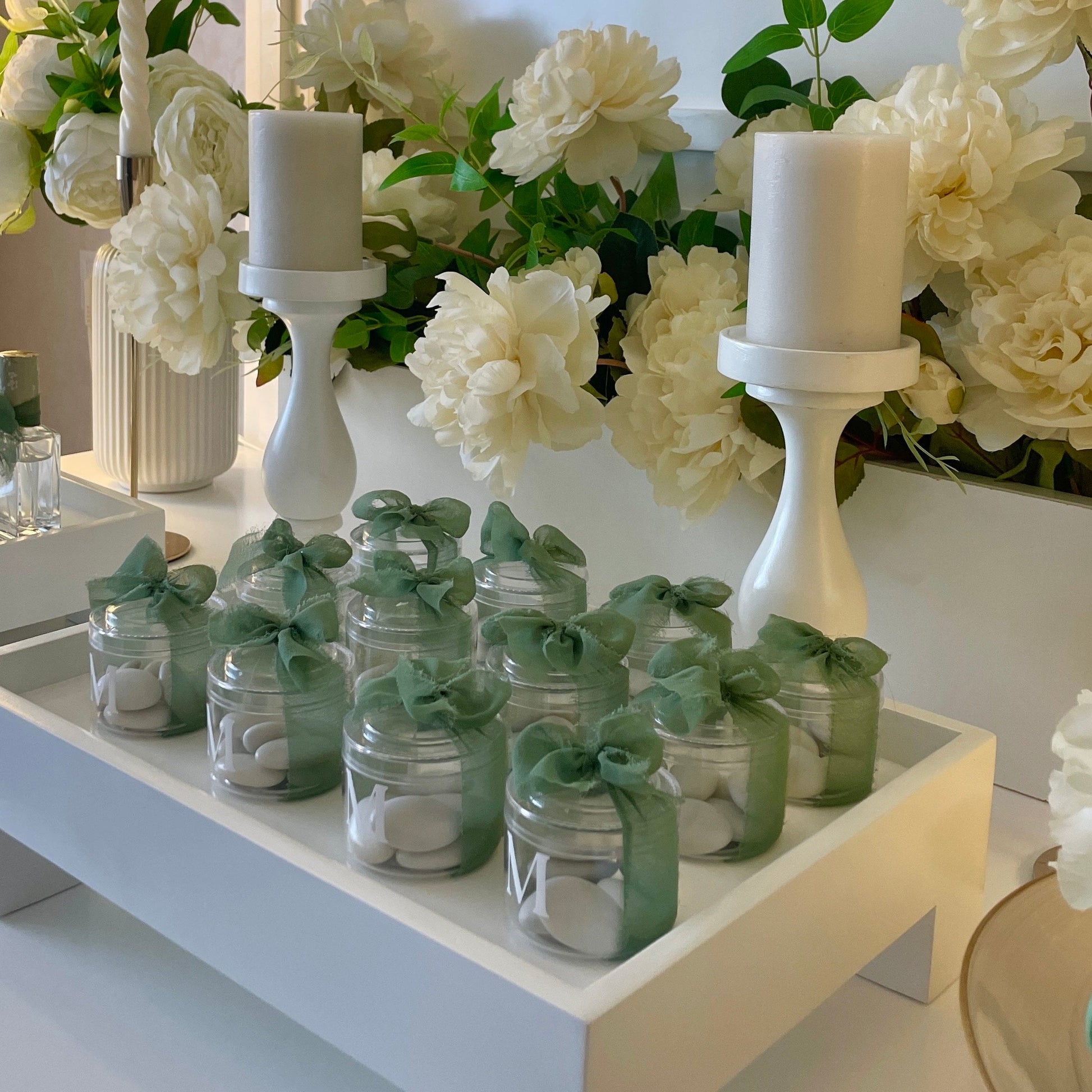 Le tout est sublimé par un ruban organza vert olive, noué délicatement à la main pour apporter une touche naturelle, fraîche et harmonieuse à votre décoration.