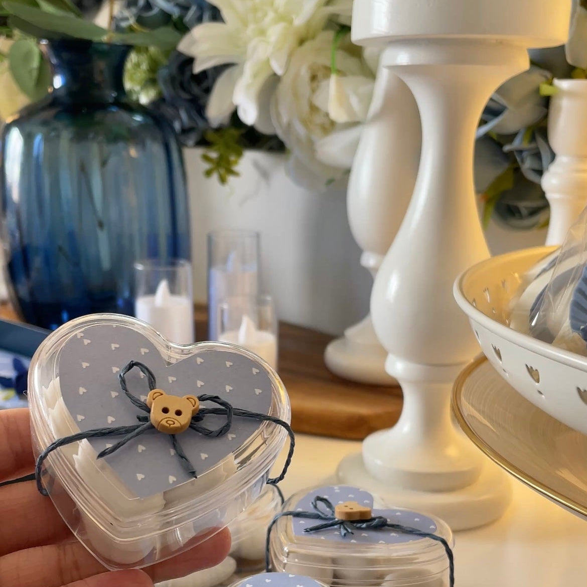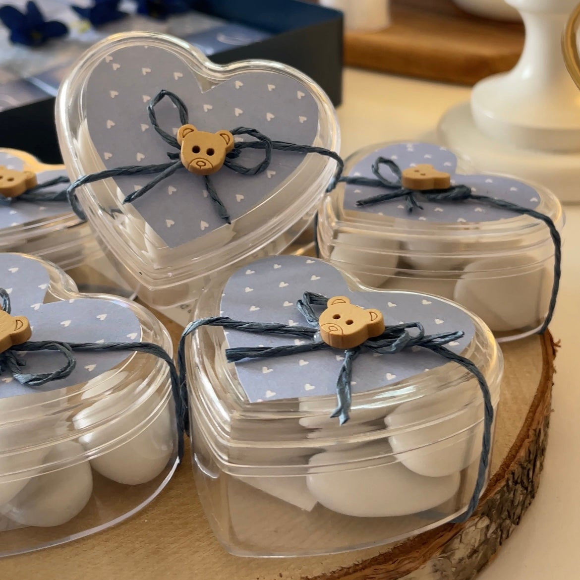 Grâce à sa transparence, les dragées blanches ressortent joliment, offrant un contraste harmonieux avec le bleu du couvercle et le naturel du petit ours.