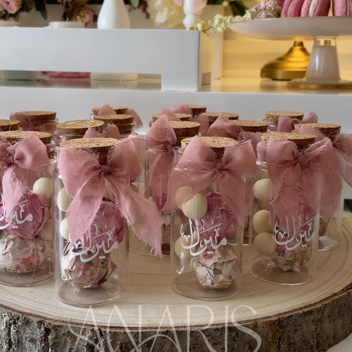 Ces mignon bouteilles en verre renferment un trésor sucré : chocolats et confiseries délicatement enveloppés dans des teintes pastel.