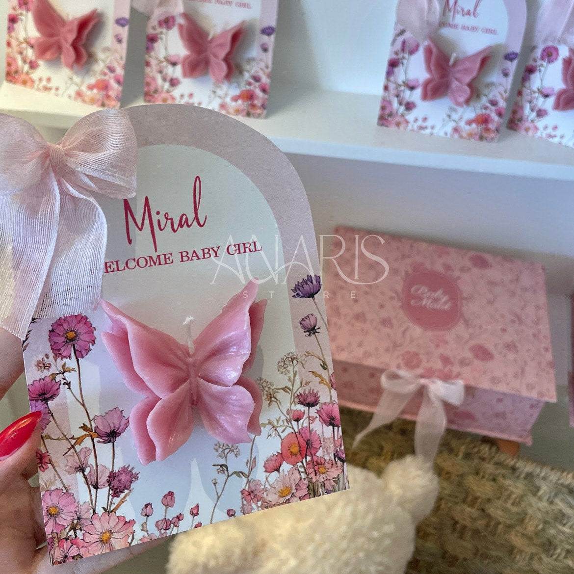 Chaque carte est soigneusement décorée d’un joli ruban en rose pâle et ornée d’une bougie artisanale en forme de papillon, symbolisant la douceur et la légèreté des premiers instants de vie.