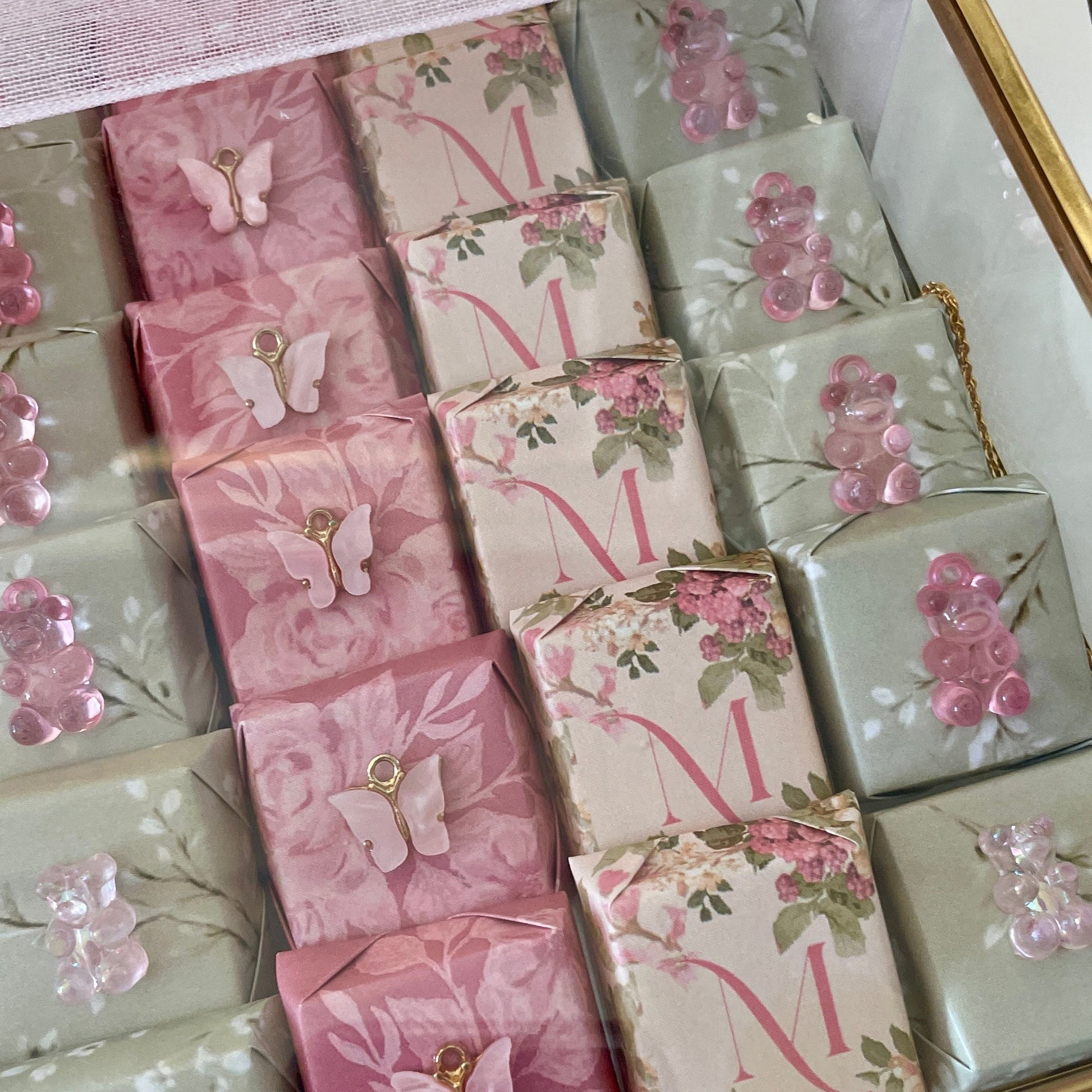 Chaque carré de chocolat est soigneusement emballé dans un papier raffiné aux teintes pastel — rose poudré, vert sauge et motifs floraux — et orné d’un charm délicat en forme de papillon ou d’ourson rose, pour une touche de poésie et de tendresse.