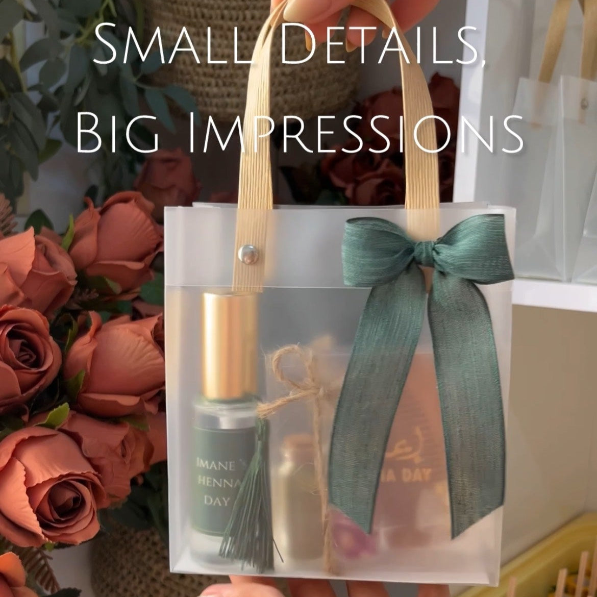 Un élégant coffret cadeau présenté dans un sac en plexiglas givré avec anses en bois naturel et orné d’un joli nœud en ruban vert foncé.