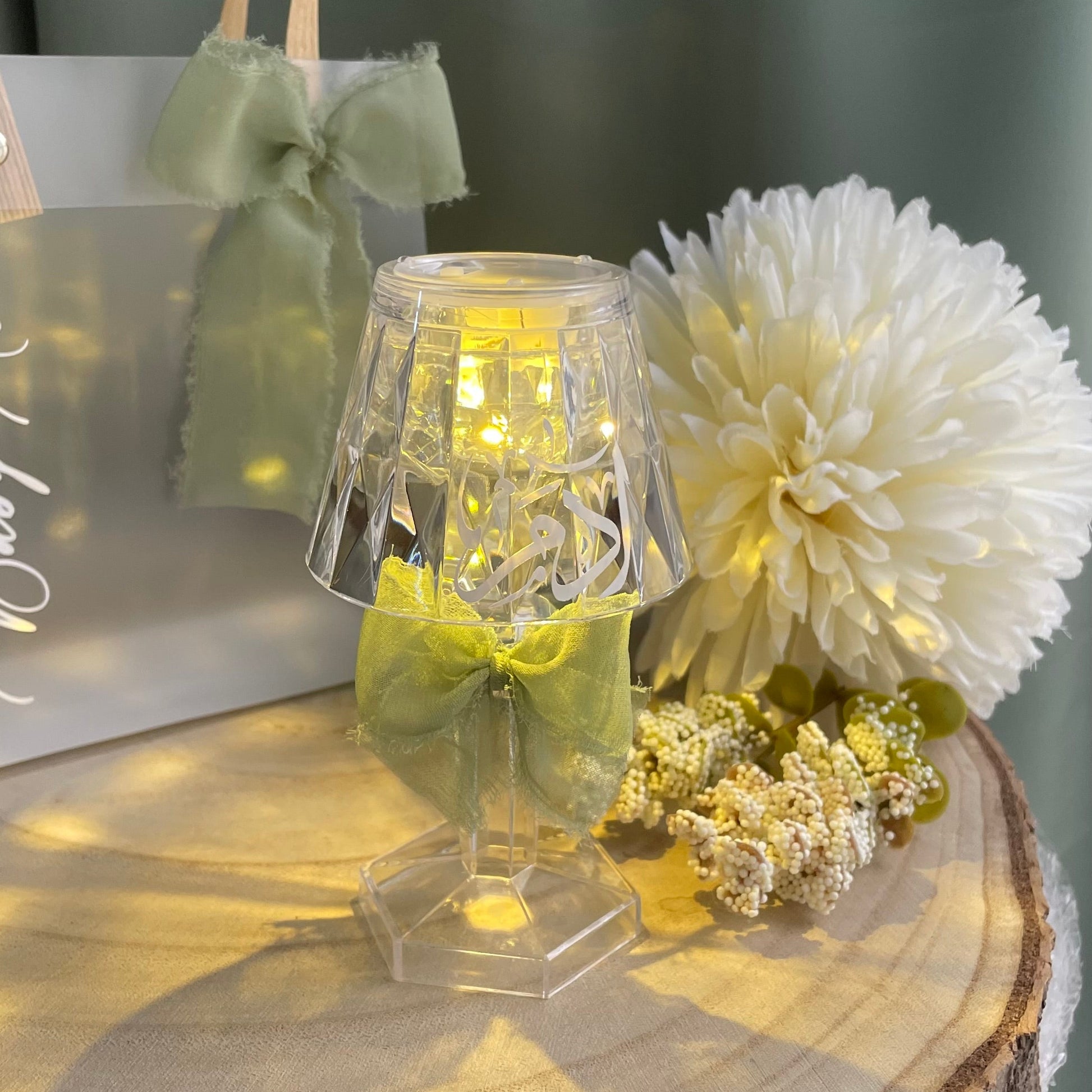 La veilleuse est ornée d’une calligraphie élégante, gravée avec finesse, et agrémentée d’un nœud en muslin vert sauge, apportant une touche de fraîcheur, de douceur et de modernité. Sa lumière LED diffuse une lueur jaune chaude, idéale pour créer une atmosphère conviviale et réconfortante.